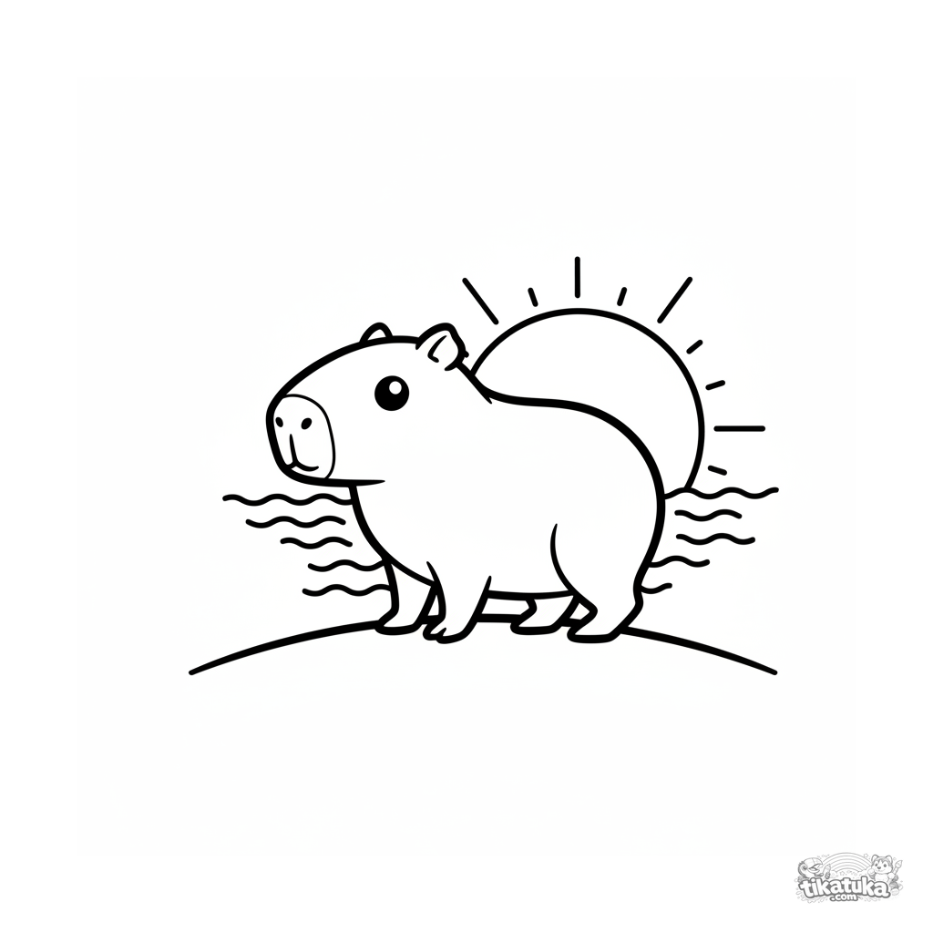 Очень простая раскраска для малышей 2-3 лет: большой силуэт капибары смотрит на закат. Толстые контуры, огромные области для закрашивания, без мелких деталей.