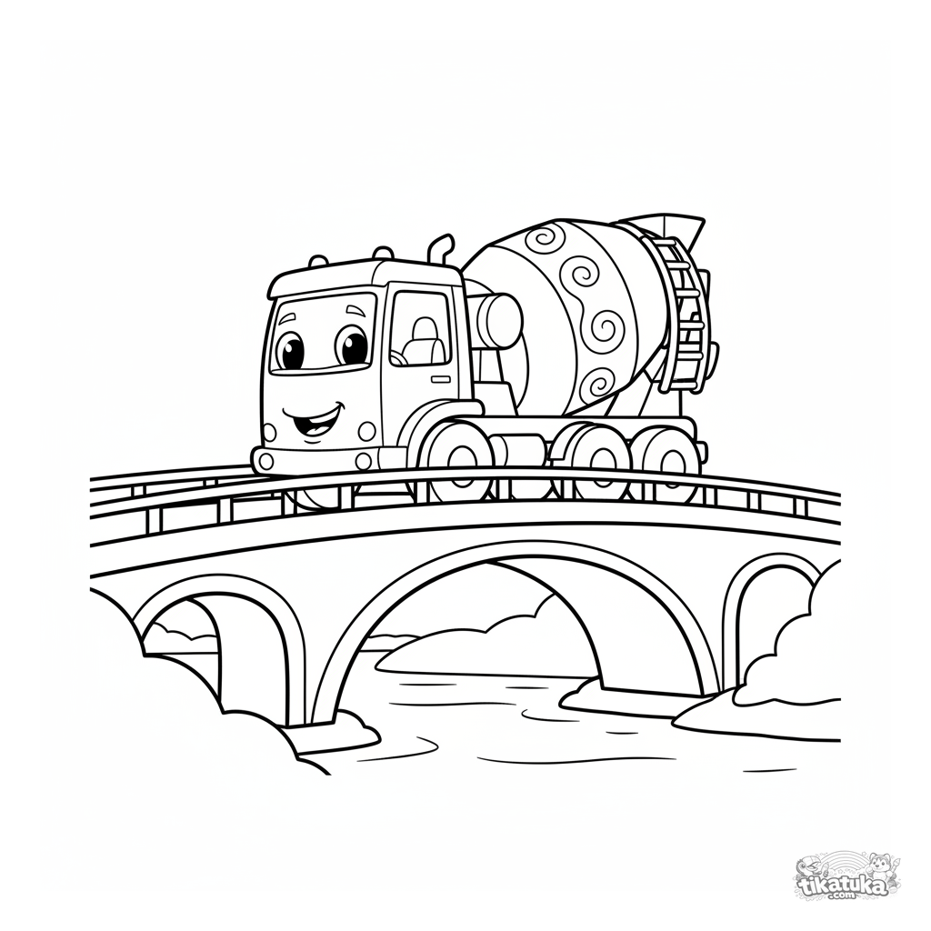 Очень простая раскраска для малышей 2-3 лет: большая бетономешалка едет по мосту над рекой. Крупные чёткие формы, идеально для первых карандашей.