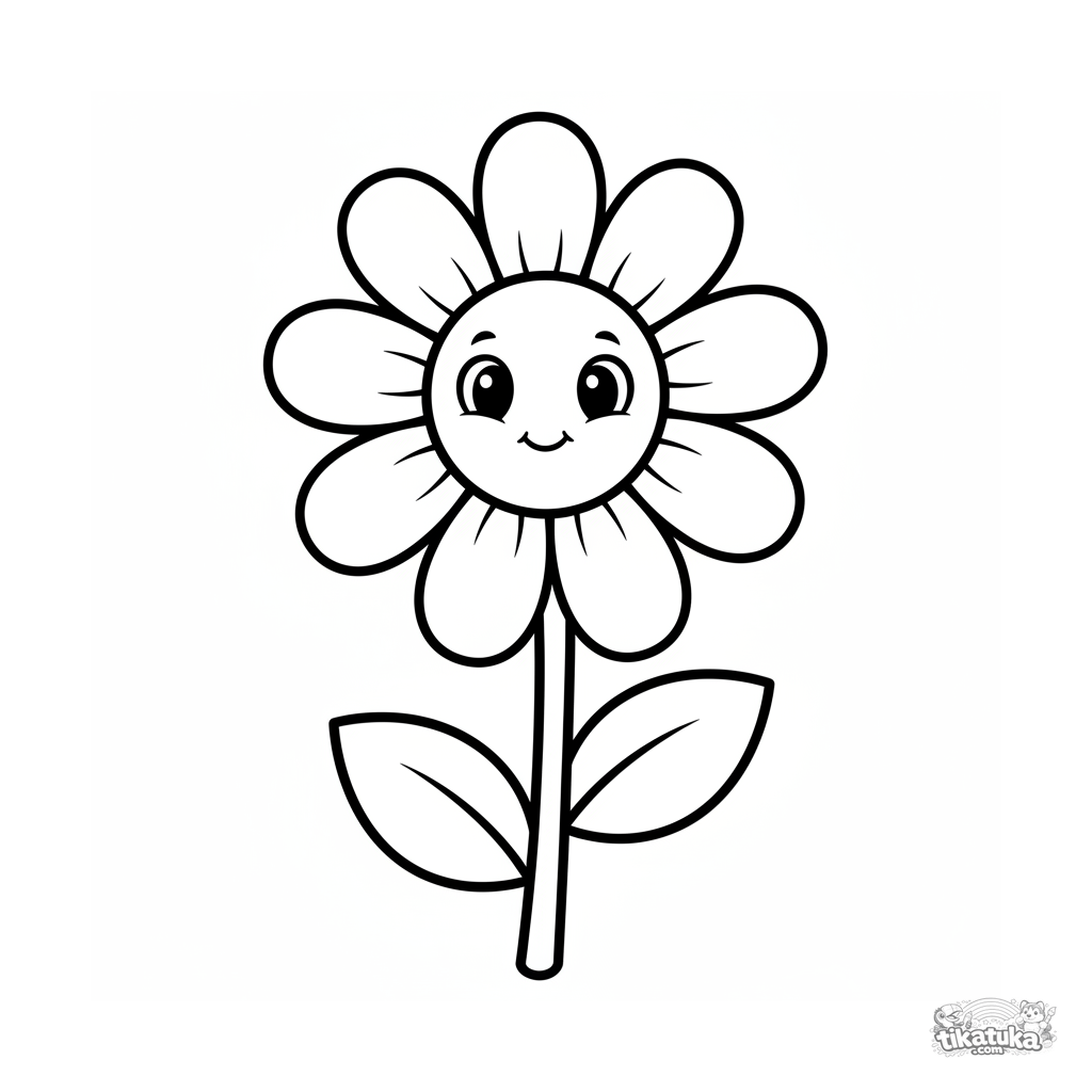 Очень простая раскраска с большой ромашкой для малышей 2-3 лет. Огромные белые поля, толстые контуры, одна ромашка на стебле.