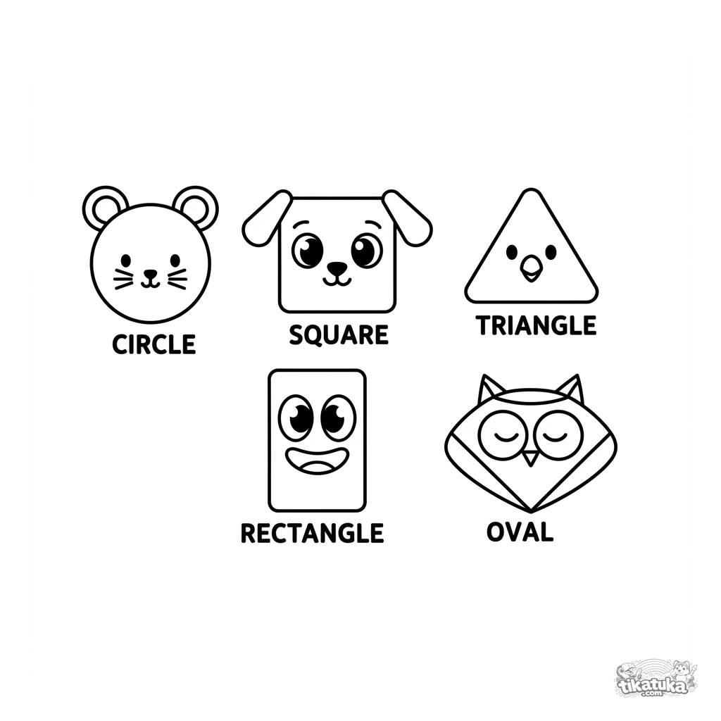 Обучающая раскраска для малышей с геометрическими фигурами в виде милых животных. Простые крупные формы помогают изучать названия фигур. Для детей 2-3 лет.