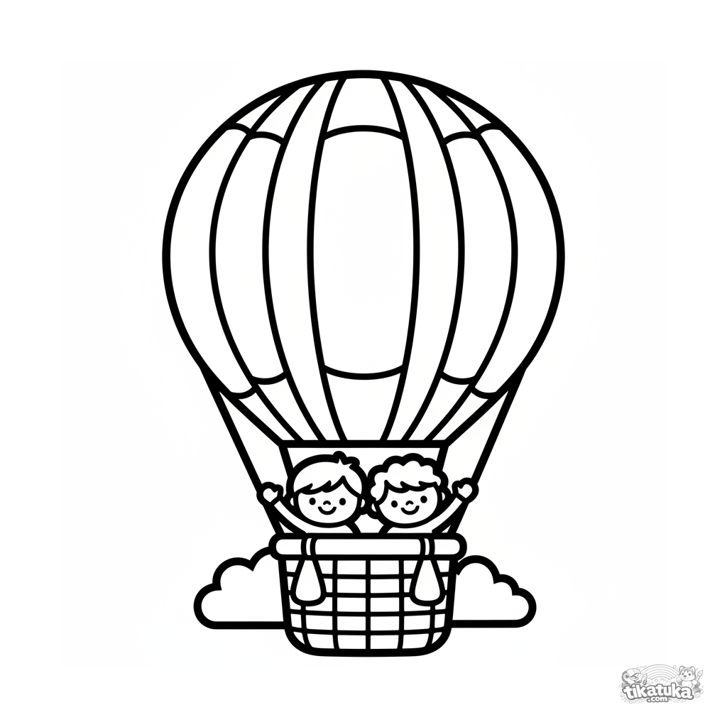 Очень простая раскраска для малышей 2-3 лет: воздушный шар с полосками и корзиной, в которой дети. Крупные замкнутые области, минимум линий.
