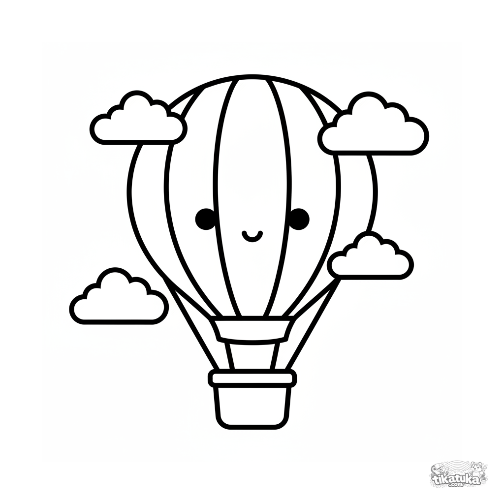 Очень простая раскраска для малышей 2-3 лет: воздушный шар с полосками летит в облаках. Огромные области для закрашивания, толстые контуры, минимум деталей.