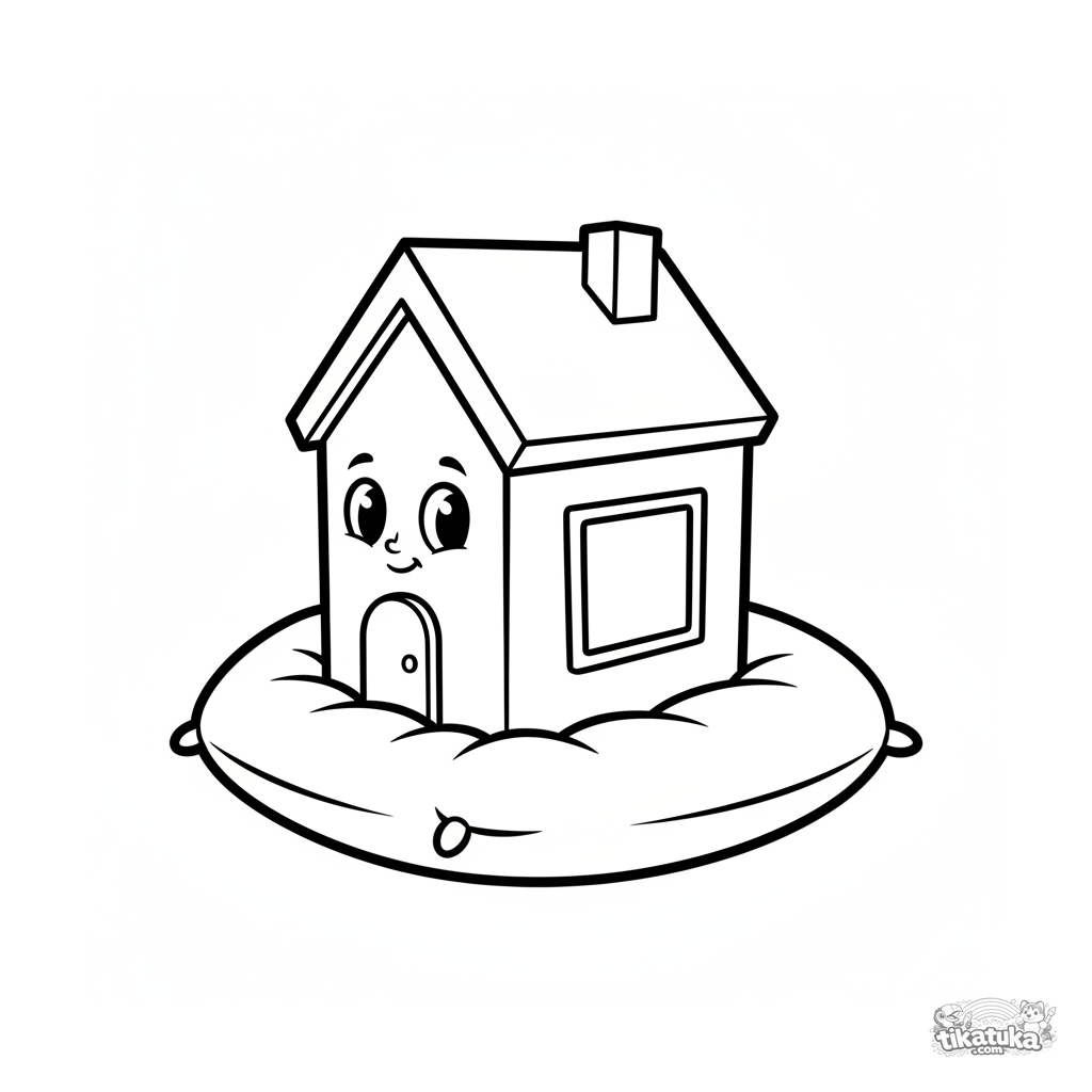 Очень простая раскраска для малышей 2-3 лет: геометрический домик стоит на мягкой подушке. Большие четкие формы, минимум деталей, широкие поля для раскрашивания.