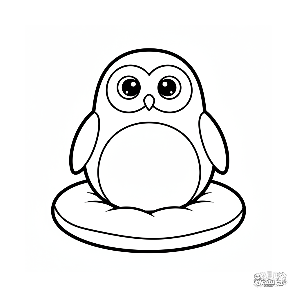 Детская раскраска для возраста 2-3 года: круглая плюшевая сова с большими глазами сидит на мягкой подушке. Максимально простые формы, минимум деталей.