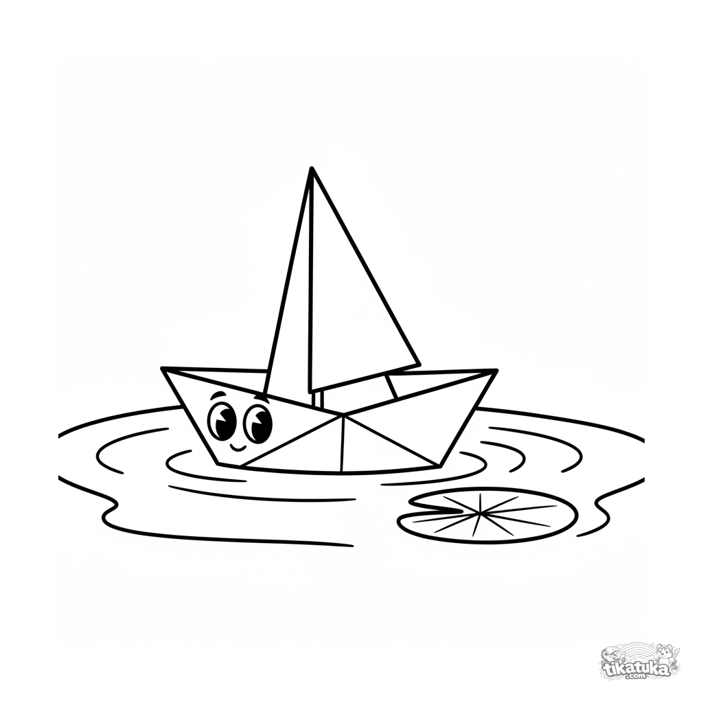 Очень простая раскраска для малышей от 2 лет: бумажная лодочка-оригами плывёт по спокойному пруду. Крупные, чёткие формы, минимум деталей.