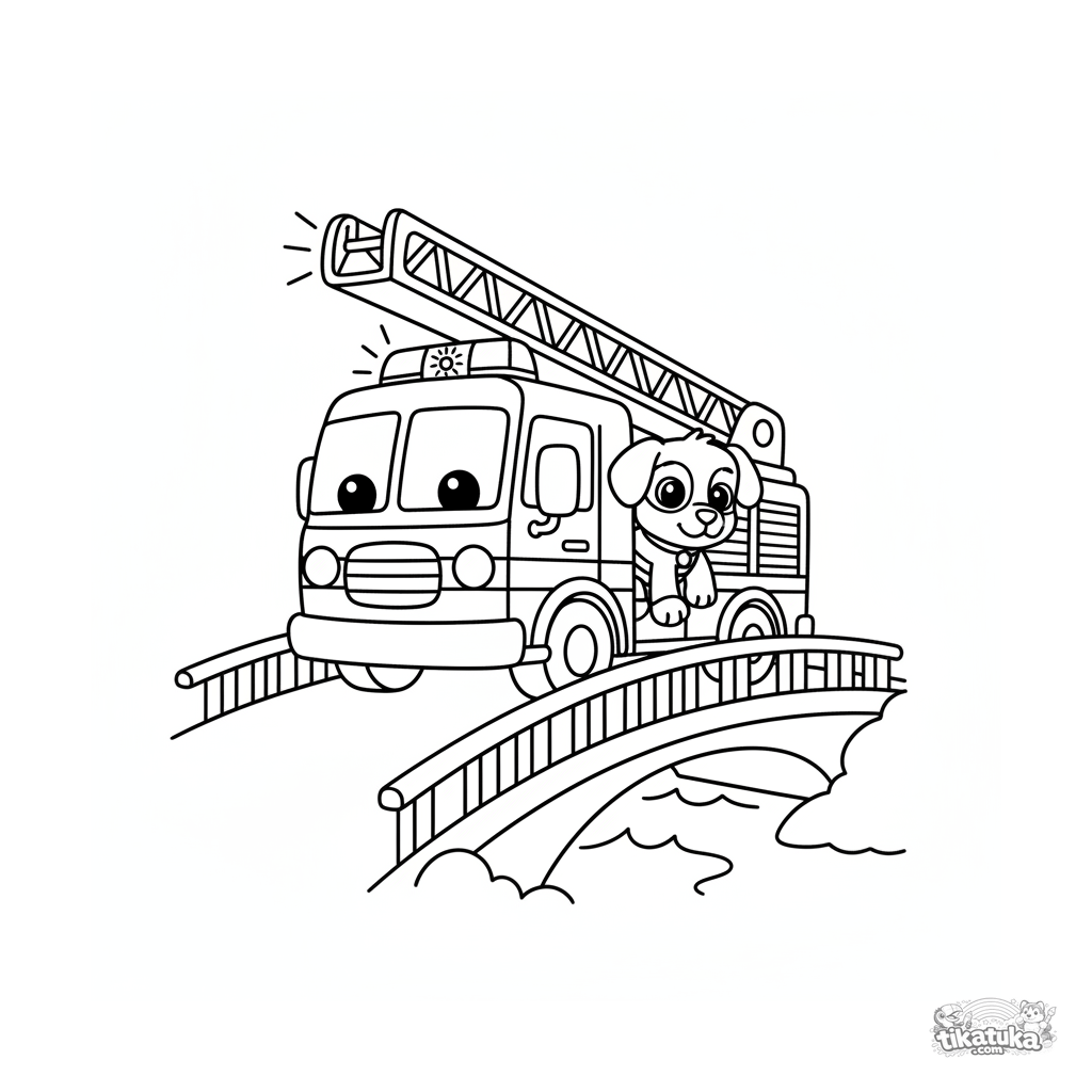 Раскраска для малышей 2-3 года: большая пожарная машина остановилась на мосту через реку. Собака-пожарный выходит из кабины. Огромные простые формы, толстые контуры, много места для раскрашивания.