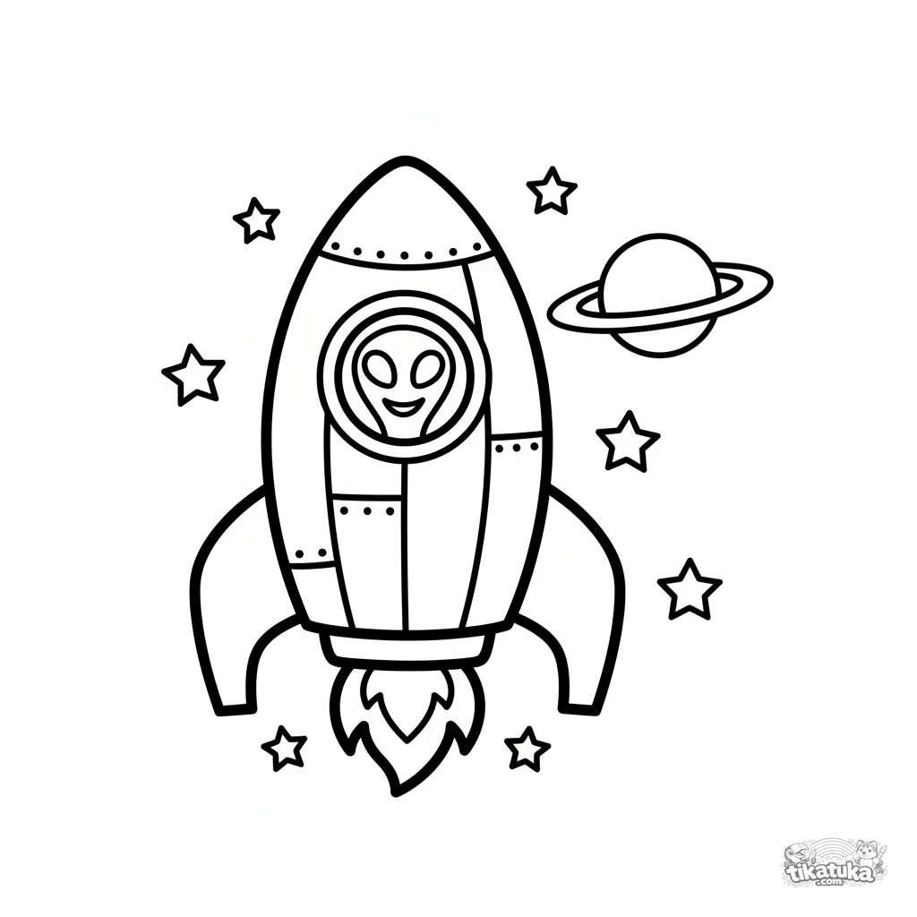Очень простая раскраска для малышей 2-3 лет: весёлая ракета с улыбающимся инопланетянином в окошке летит среди звёзд. Крупные замкнутые формы, минимум деталей.