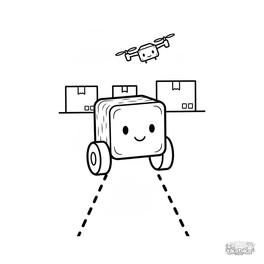 Раскраска для малышей 2-3 года: простой робот-кубик катится по складу. Огромные области для закрашивания, очень простые формы, улыбающаяся мордочка.
