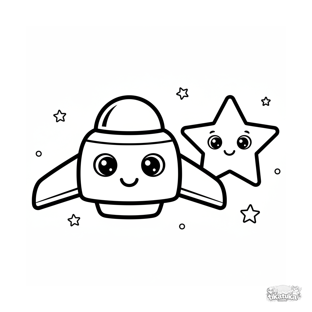 Раскраска для малышей 2-3 года: простая добрая ракета с улыбкой и большая звезда в открытом космосе. Огромные белые поля, четкие контуры, идеально для первых раскрасок.