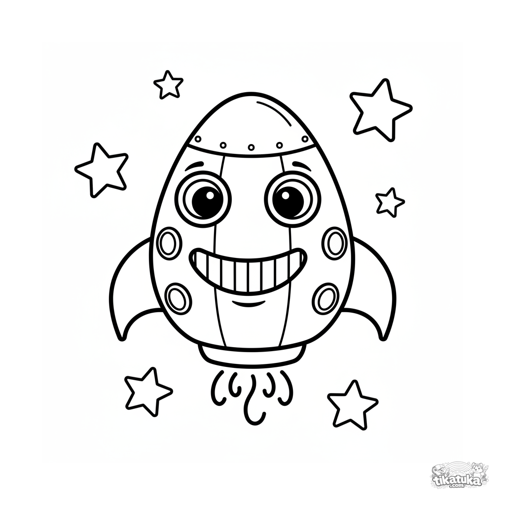 Самая простая раскраска для малышей 2-3 лет: улыбающийся космический корабль летит среди звезд. Огромные толстые контуры, одна большая форма, никаких мелких деталей.