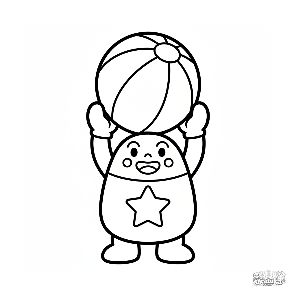 Простая раскраска для малышей 2-3 лет: улыбающийся сильный супергерой держит большой мяч, крупные формы и широкие поля для раскрашивания.