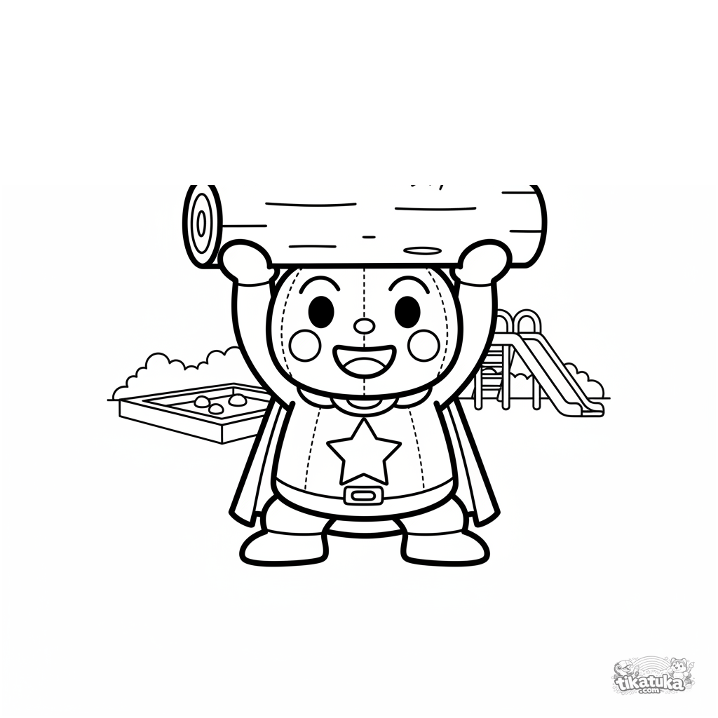Простая раскраска для малышей 2-3 года: добрый сильный супергерой поднимает бревно на детской площадке, чтобы расчистить дорожку, улыбается.