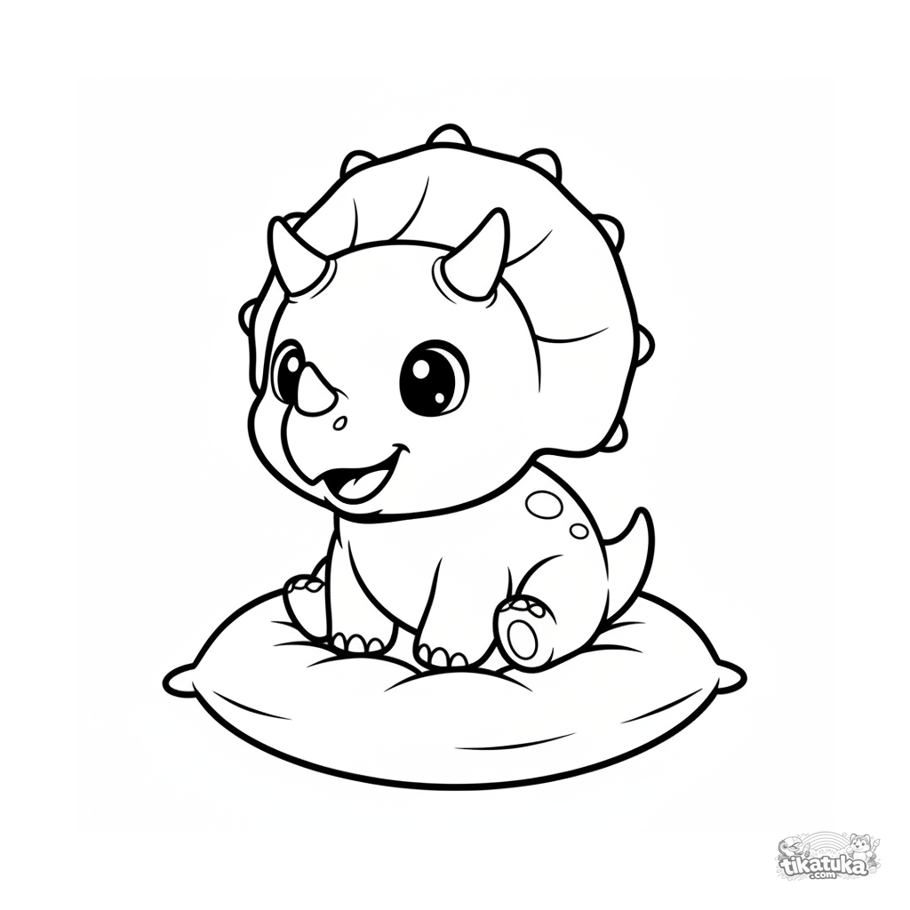 Раскраска для малышей: добрый трицератопс с большими глазками сидит на мягкой подушке. Крупные понятные формы, легко раскрашивать.
