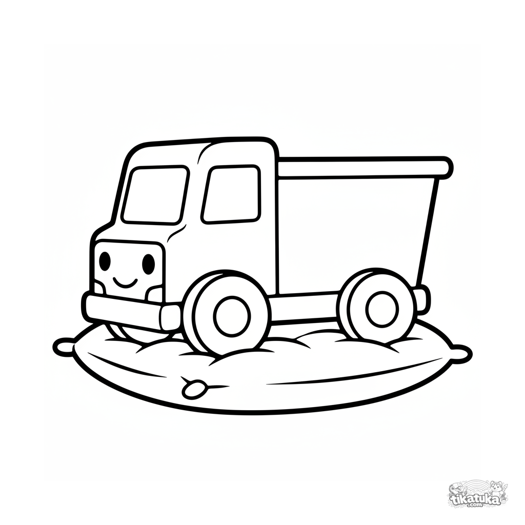 Раскраска для мальчиков и девочек 2-3 лет: простой игрушечный грузовик с улыбкой стоит на подушке. Крупные геометрические формы.