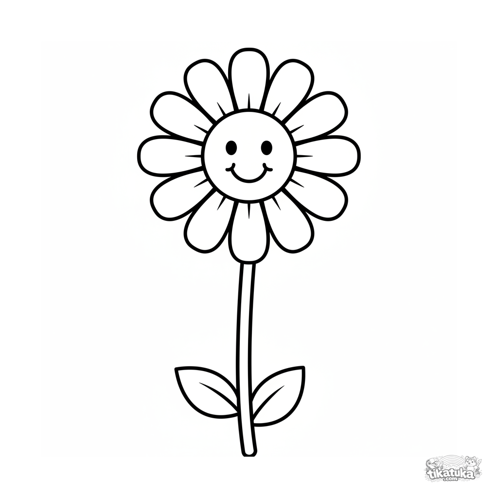 Очень простая раскраска для малышей 2-3 лет: одна крупная ромашка на длинном стебле. Максимально простые формы и огромные белые поля.