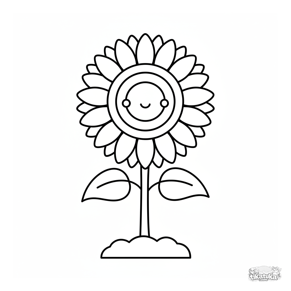 Раскраска для малышей 2-3 лет: большой и простой подсолнух с толстыми контурами, растущий из земли. Крупные области для раскрашивания.