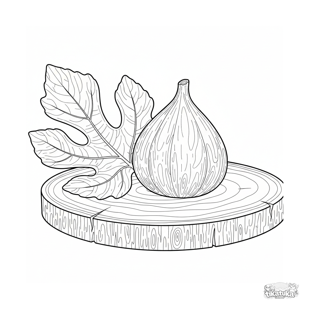 Реалистичная раскраска для детей 10-12 лет: детальный натюрморт с инжиром на деревянной поверхности. Акцент на текстуре кожицы и листа.
