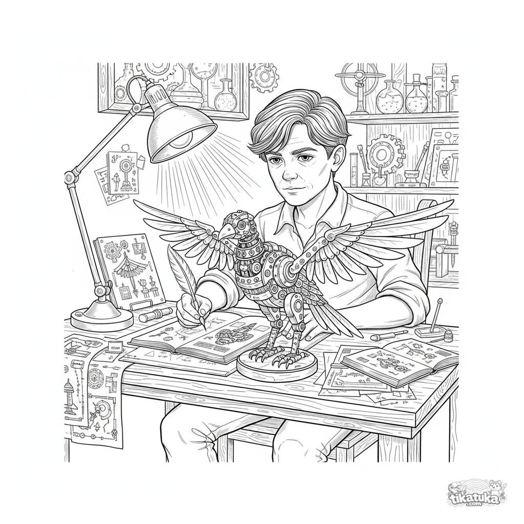 Сложная раскраска для детей 10-12 лет: изобретатель в секретной лаборатории зарисовывает детальный дизайн сложной механической птицы на своем чертежном столе.