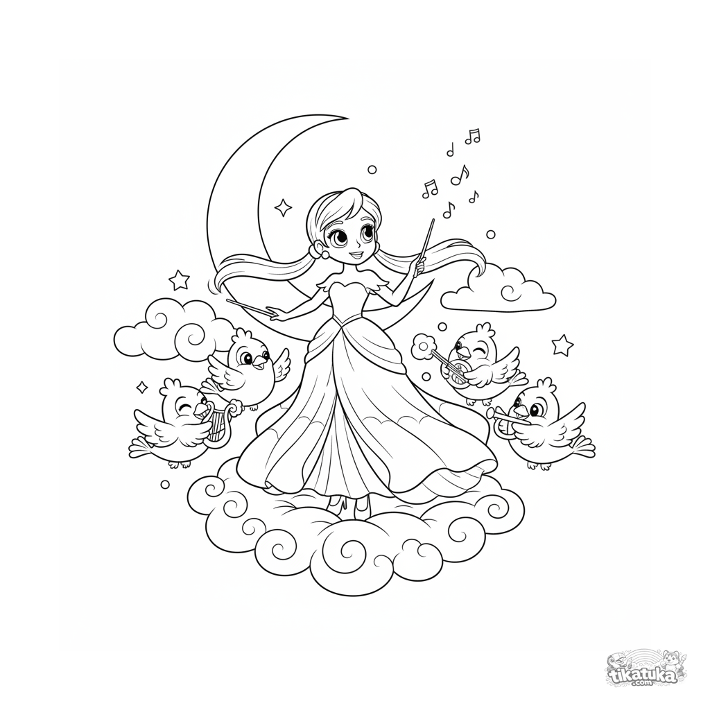Раскраска для детей 7-9 лет: небесная принцесса дирижирует оркестром из птиц-облаков на платформе из облаков. Парящие ноты и полумесяц на фоне.