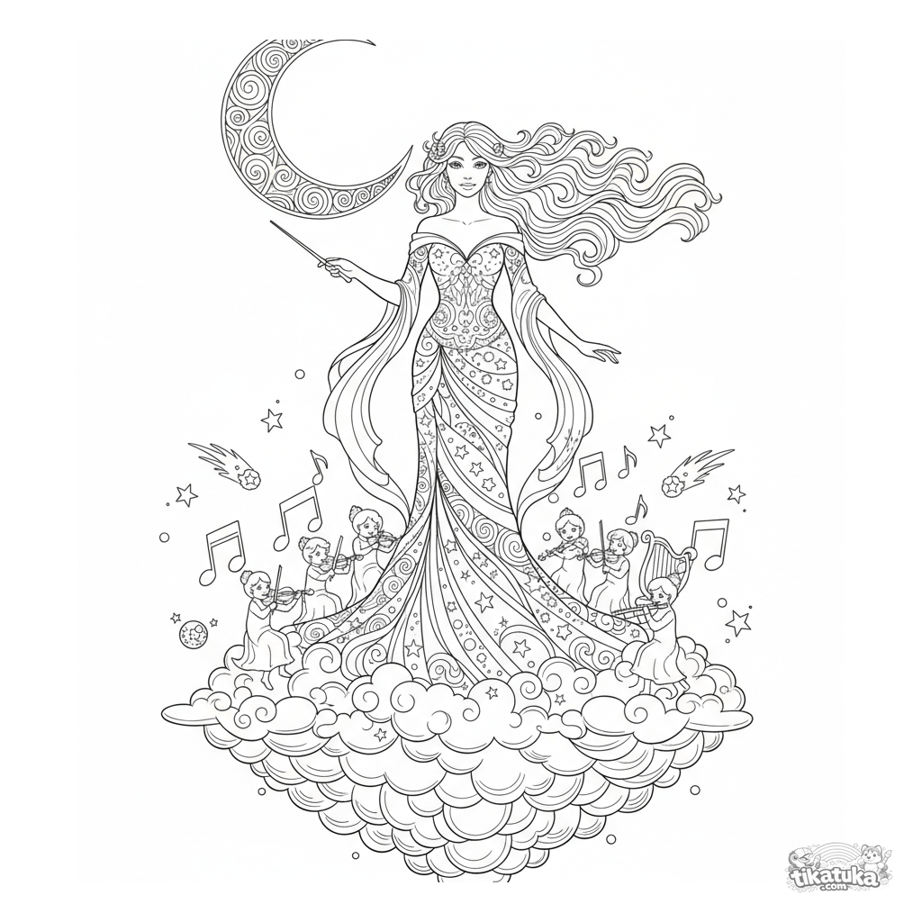 Детальная раскраска для девочек 10-12 лет: небесная принцесса дирижирует оркестром из звёздных нот на облачной террасе. Сложные узоры и плавные линии.