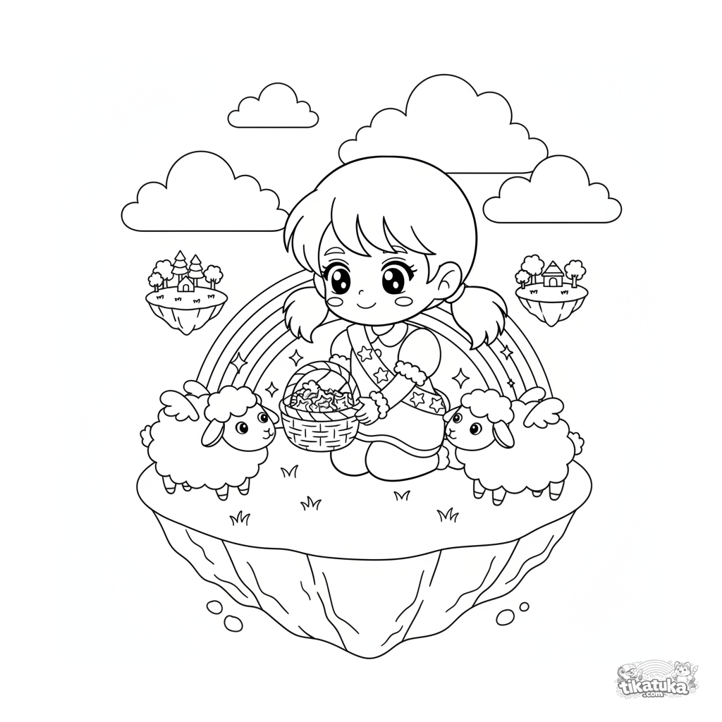 Раскраска для детей 4-6 лет: небесная принцесса на парящем острове угощает звездными лакомствами пушистых облачных овечек. Яркая, добрая сцена.