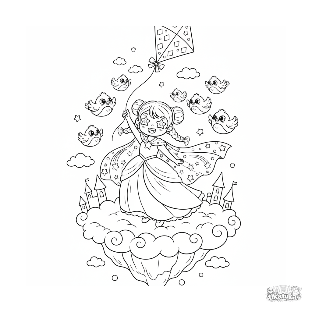 Раскраска для детей 4-6 лет: принцесса небес в звёздном плаще запускает воздушного змея с облачной террасы, вокруг летают птички.