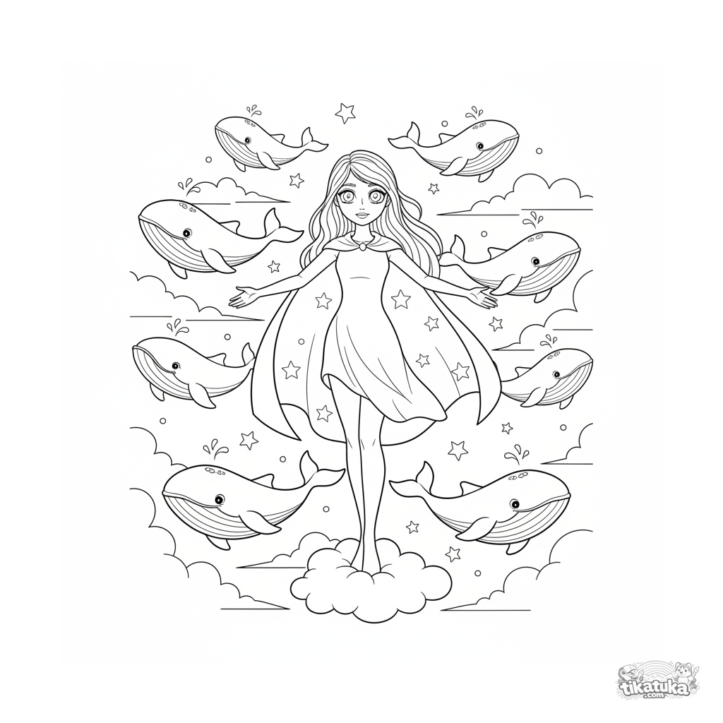 Раскраска для детей 7-9 лет: небесная принцесса ведёт парад летающих китов по звёздному небу. Волшебная и добрая сцена.