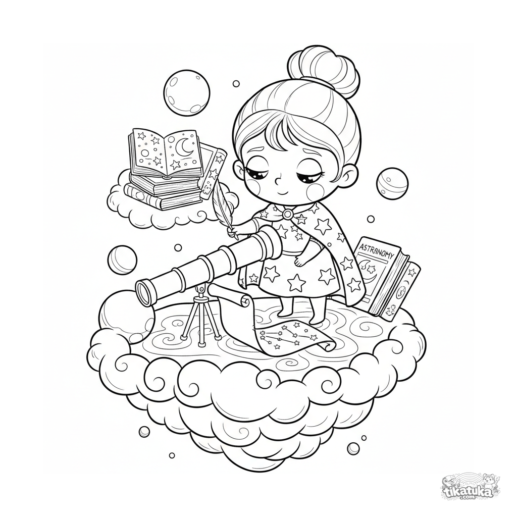 Раскраска для детей 7-9 лет: небесная принцесса изучает звёзды в своей облачной обсерватории. Сцена с телескопом, свитками и парящими планетами.