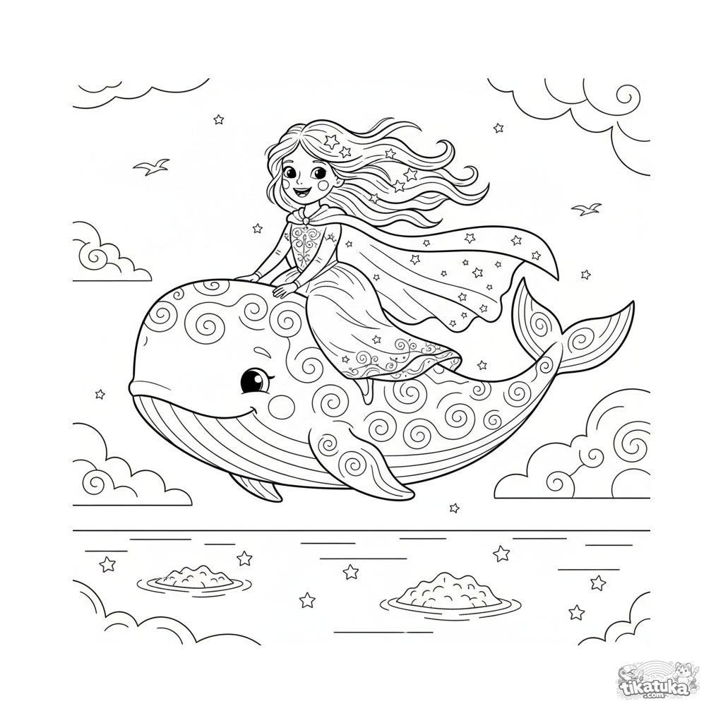 Раскраска для детей 7-9 лет: небесная принцесса в звёздном плаще летит на спине доброго облачного кита над ночным морем.