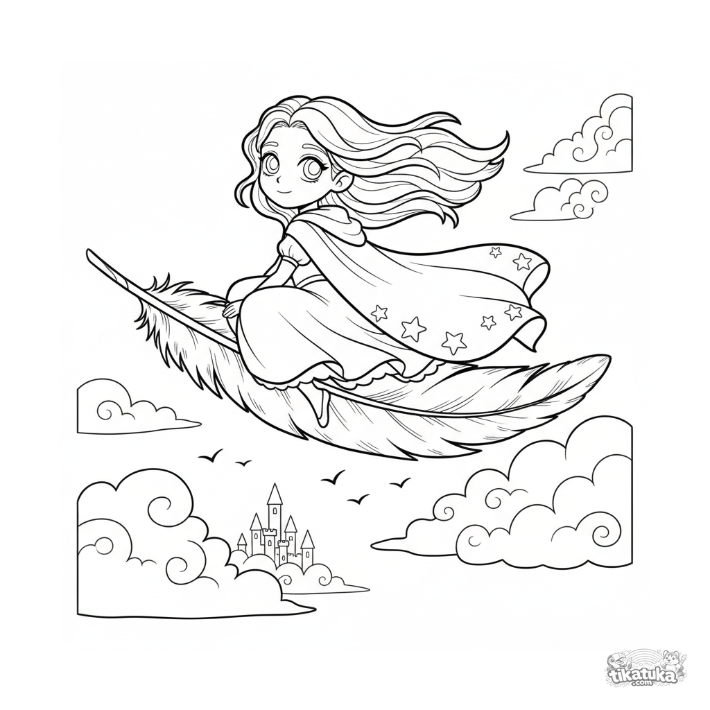 Раскраска для детей 7-9 лет: принцесса небес в развевающемся плаще катается на гигантском пере над королевством облаков с виднеющимся вдали замком.