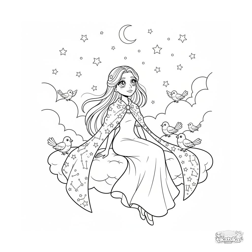 Раскраска для детей 7-9 лет: небесная принцесса в звёздном плаще сидит на облачной террасе и смотрит на ночное небо.