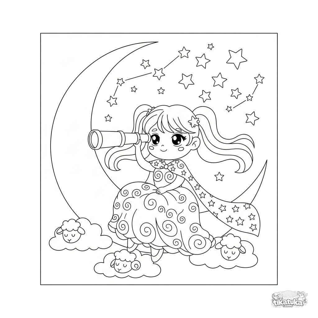 Раскраска для детей 7-9 лет: небесная принцесса в платье из туманностей сидит на полумесяце и наблюдает за звёздами в телескоп.