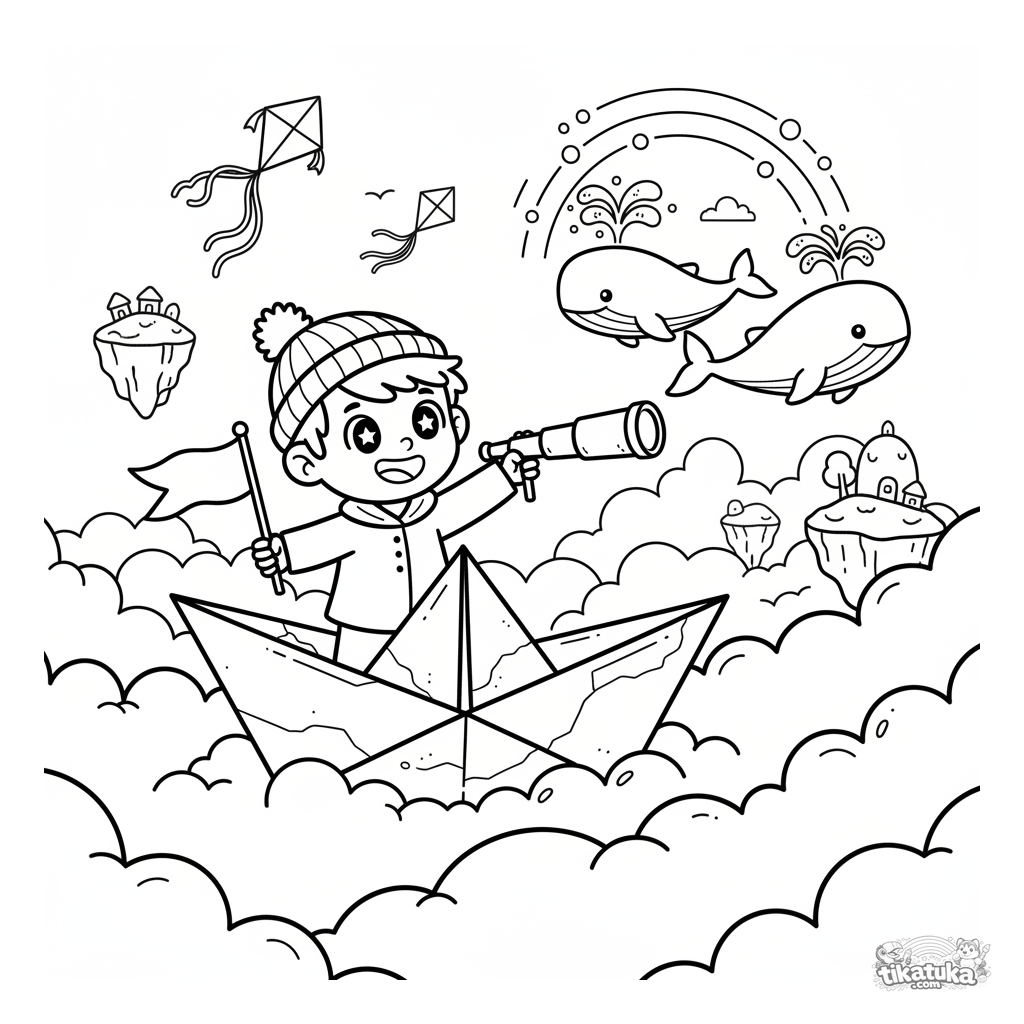 Раскраска для детей: отважный небесный моряк плывет на бумажном кораблике по морю облаков, махая флажком китам. Приключенческая сцена из мифов.