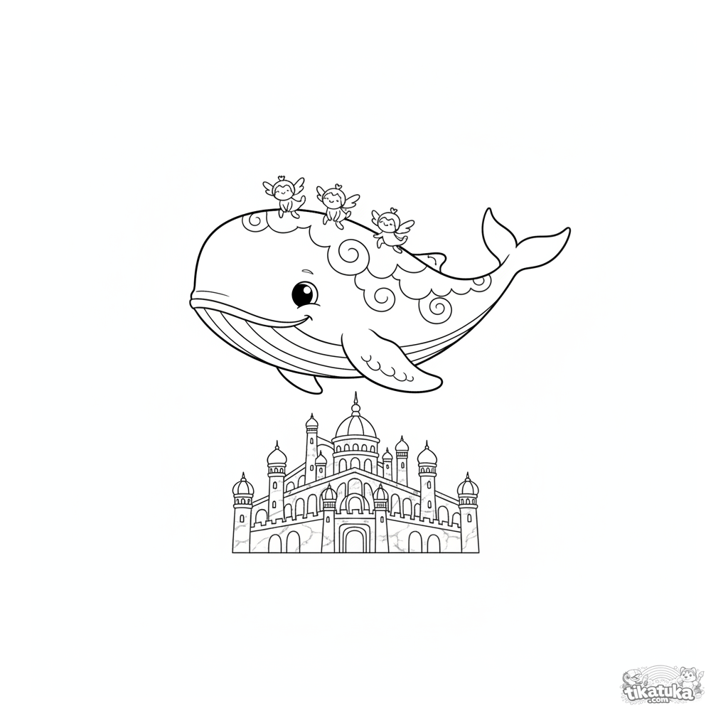 Раскраска для детей 4-8 лет: добрый небесный кит летит над величественным мраморным дворцом. Плавные линии и сказочная атмосфера для раскрашивания.