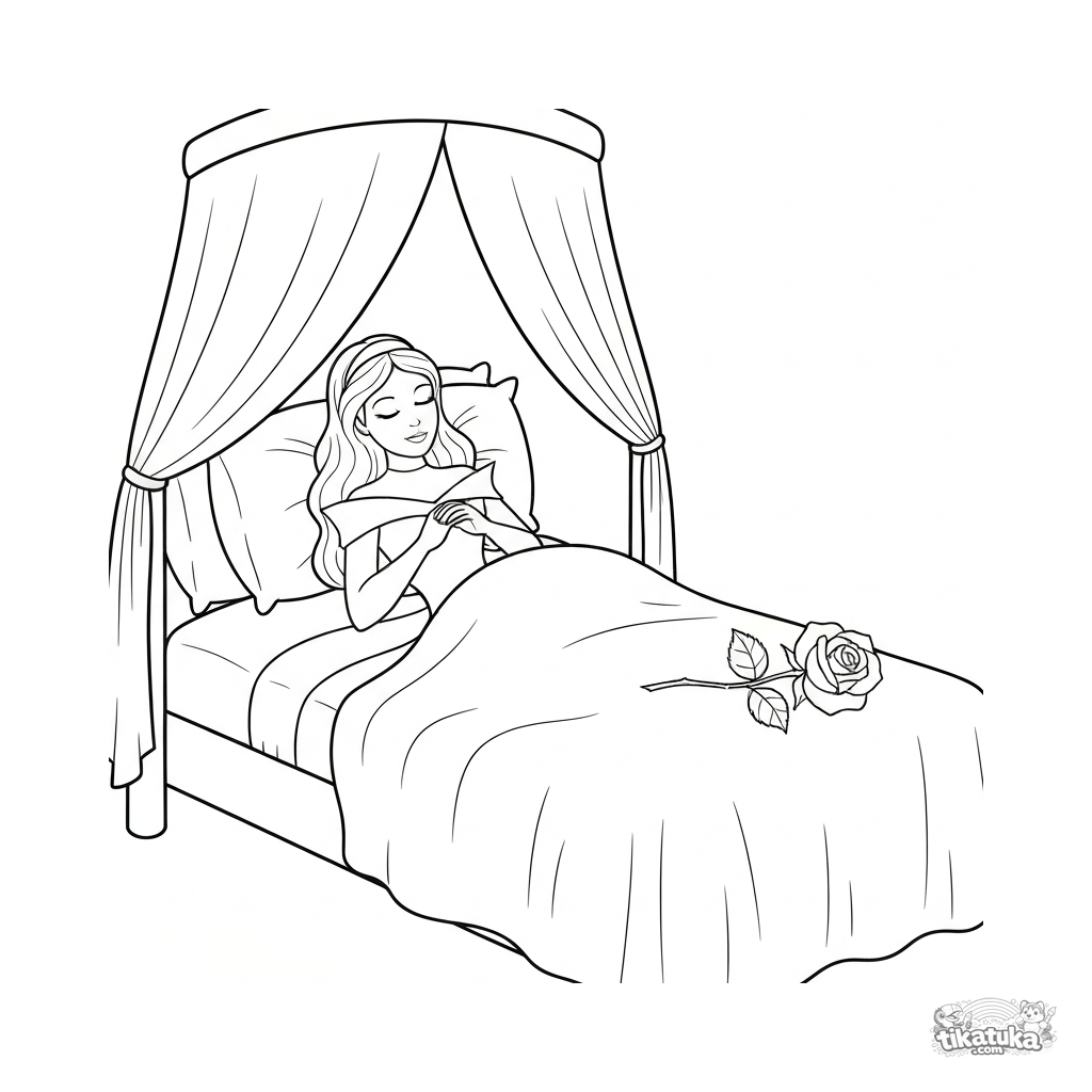 Раскраска для детей 3-5 лет. Спящая красавица мирно лежит в кровати с балдахином, руки сложены, роза на покрывале. Скачать бесплатно.