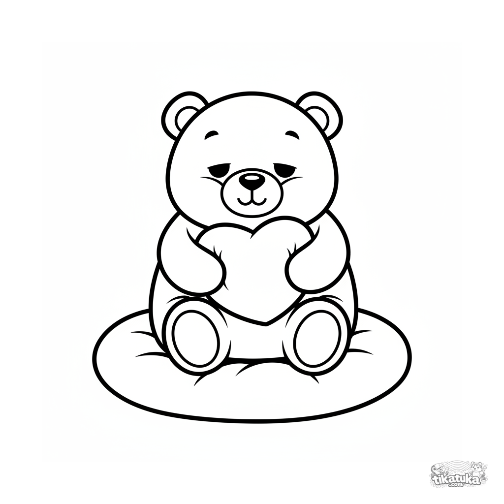 Раскраска для малышей 2-3 лет: сонный плюшевый мишка сидит на мягкой подушке. Простые крупные формы, широкие поля для легкого раскрашивания.