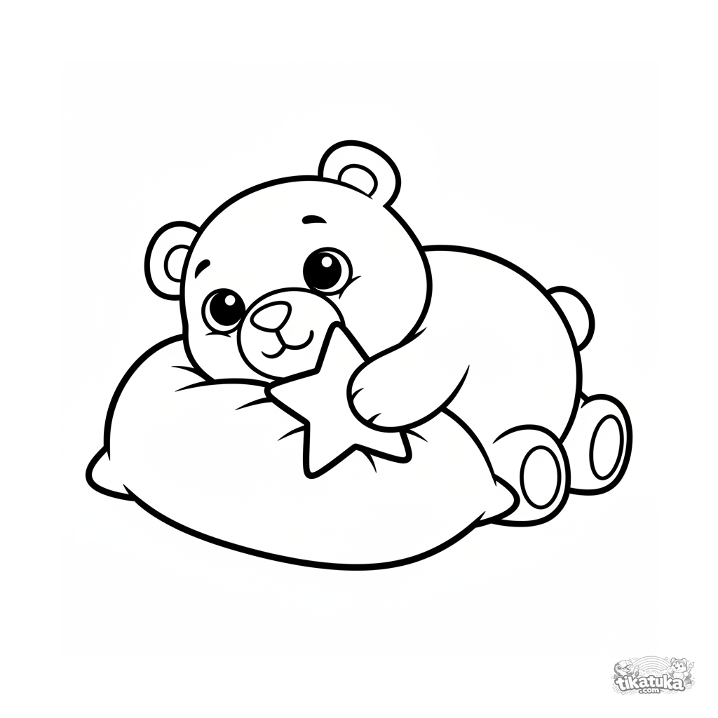 Раскраска для малышей 2-3 лет: сонный плюшевый мишка лежит на мягкой подушке. Простые крупные формы, мало деталей, идеально для первых карандашей.