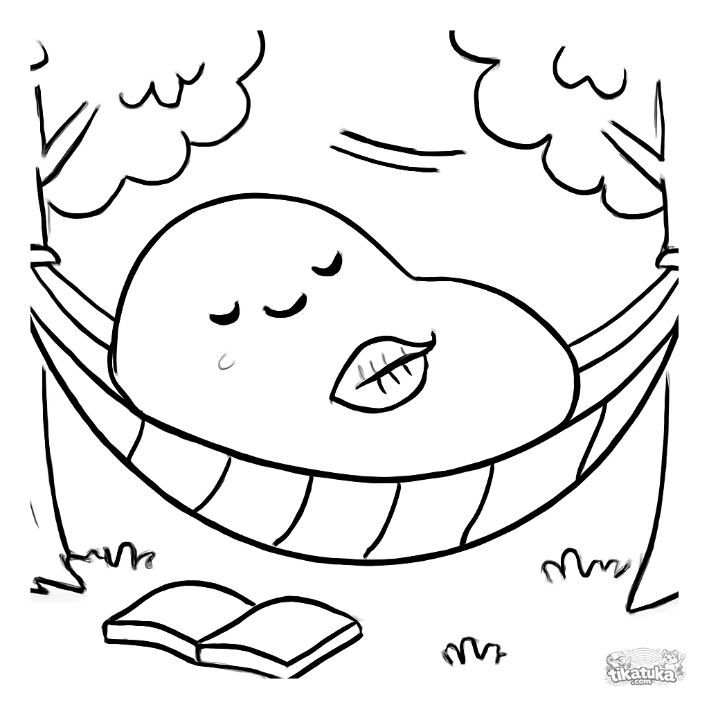 Простая раскраска: сонный монстр-капля спит в гамаке между деревьями. Для самых маленьких (2-5 лет) с широкими полями и минимальной детализацией.