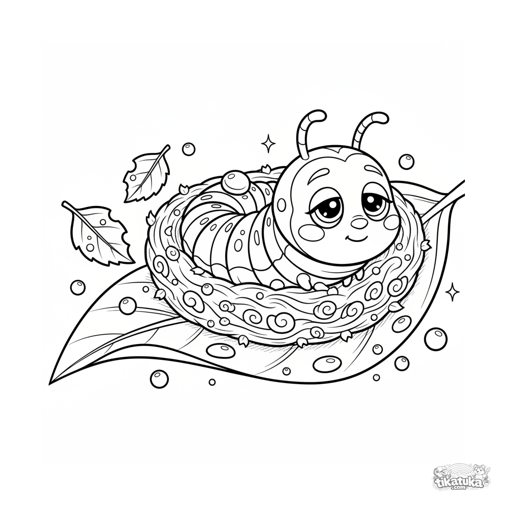 Раскраска для детей 4-6 лет: сонная пухлая гусеница спит в уютном гнездышке из шелка на большом листе с каплями росы. Милая и простая сцена.