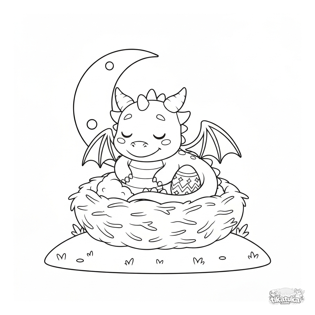 Раскраска с добрым сонным дракончиком, который охраняет яйцо в уютном гнезде. Простая картинка для малышей 2-4 лет с крупными деталями.