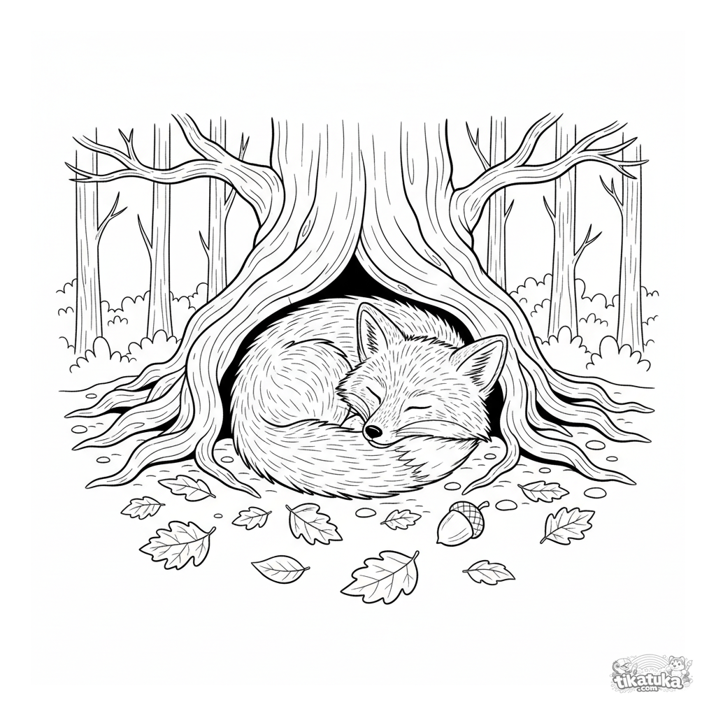 Раскраска для детей 4-6 лет: лисенок спит под старым дубом в осеннем лесу. Изображены опавшие листья и желудь. Реалистичный стиль, умиротворяющая сцена.