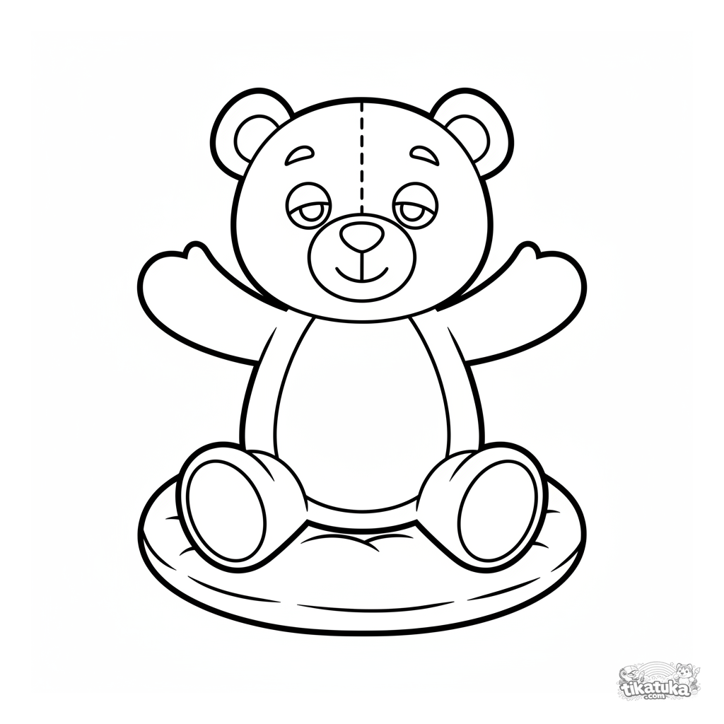 Раскраска для малышей: сонный плюшевый мишка сидит на мягкой подушке. Простые крупные формы, минимум деталей, идеально для детей 2-3 лет.