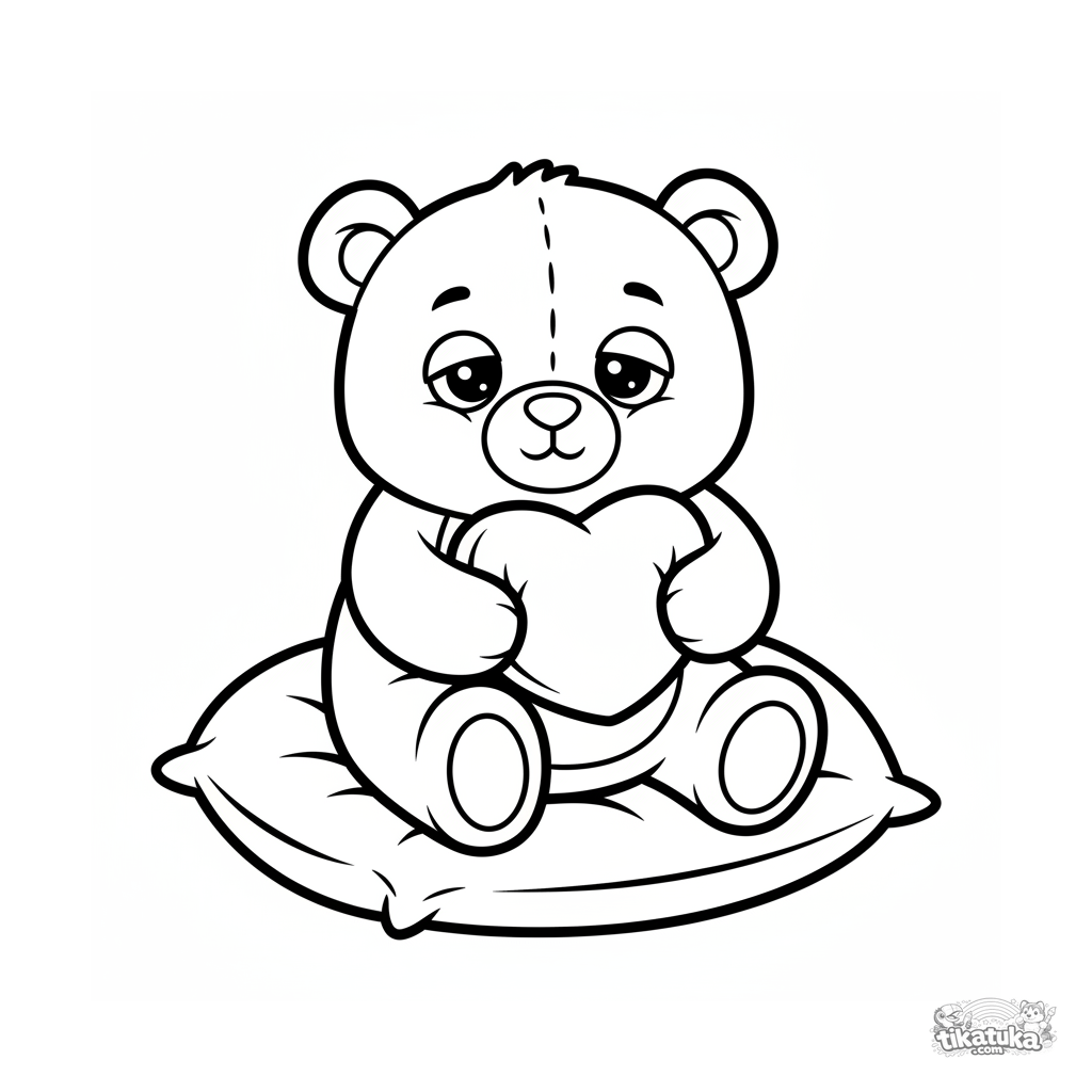 Раскраска для малышей 2-3 лет: сонный плюшевый мишка сидит на мягкой подушке. Простые крупные формы, широкие поля для легкого раскрашивания.