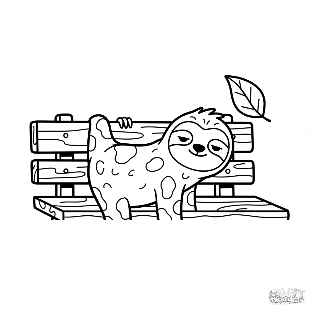 Раскраска для малышей 2-3 лет: сонный ленивец висит вниз головой на ручке парковой скамейки. Очень простые, крупные формы, идеально для первых раскрасок.