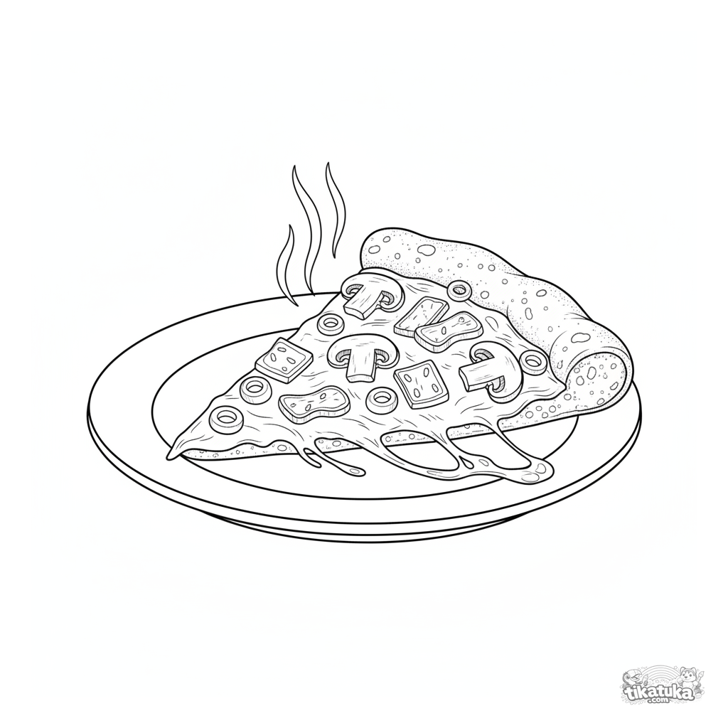 Раскраска для детей 7-12 лет: детализированный кусок пиццы с разными начинками на тарелке. Высокая сложность, реалистичный стиль, развивает внимание.