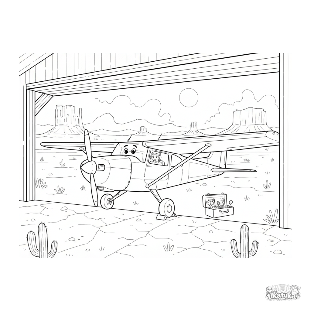 Раскраска небольшого самолета, припаркованного в ангаре на фоне пустынного пейзажа. Для детей 7-9 лет. Детали ангара, инструменты, колесный упор.