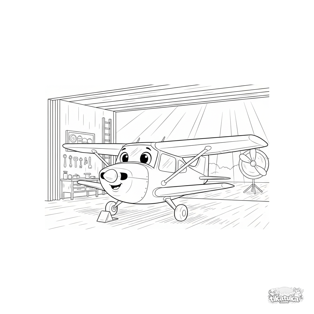 Раскраска для детей 4-6 лет: маленький самолет стоит в открытом ангаре, на него падает солнечный свет. Уютная, спокойная сцена.