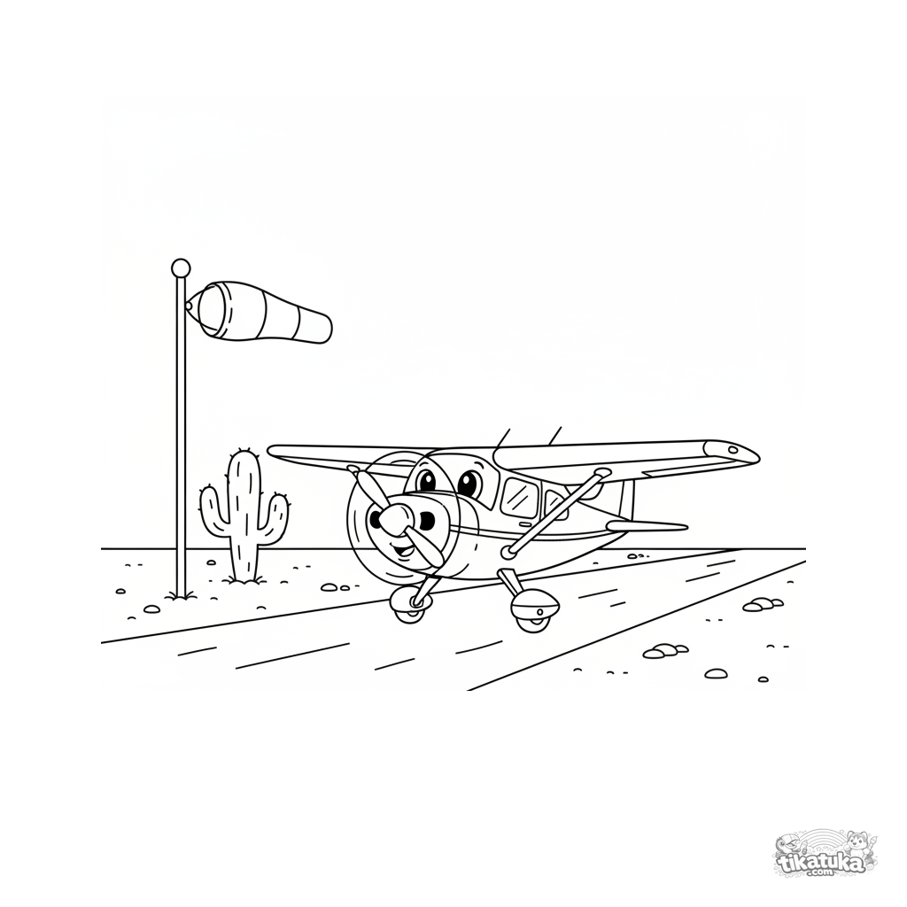 Раскраска маленького самолета, едущего по пустынной взлетной полосе. Для детей 4-6 лет. Простые формы, кактус и флюгер на фоне большого неба.