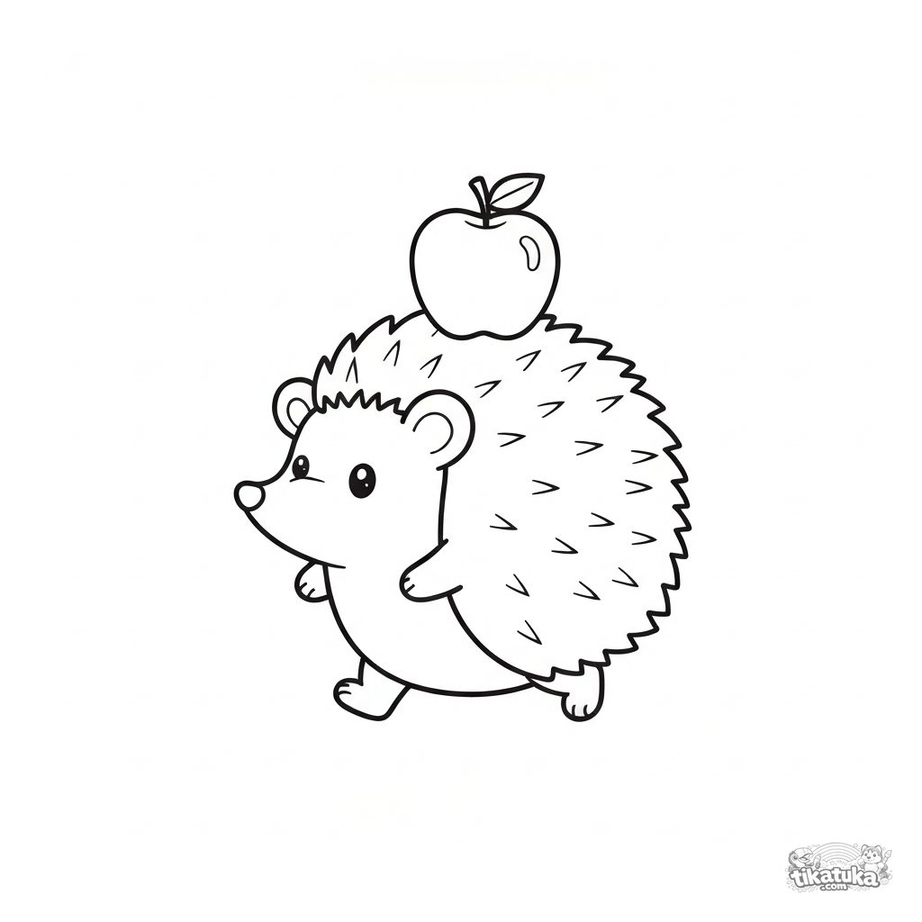 Классическая раскраска для малышей: ёжик несёт яблоко на колючей спинке. Очень простые формы и знакомый сюжет для детей 2-5 лет.
