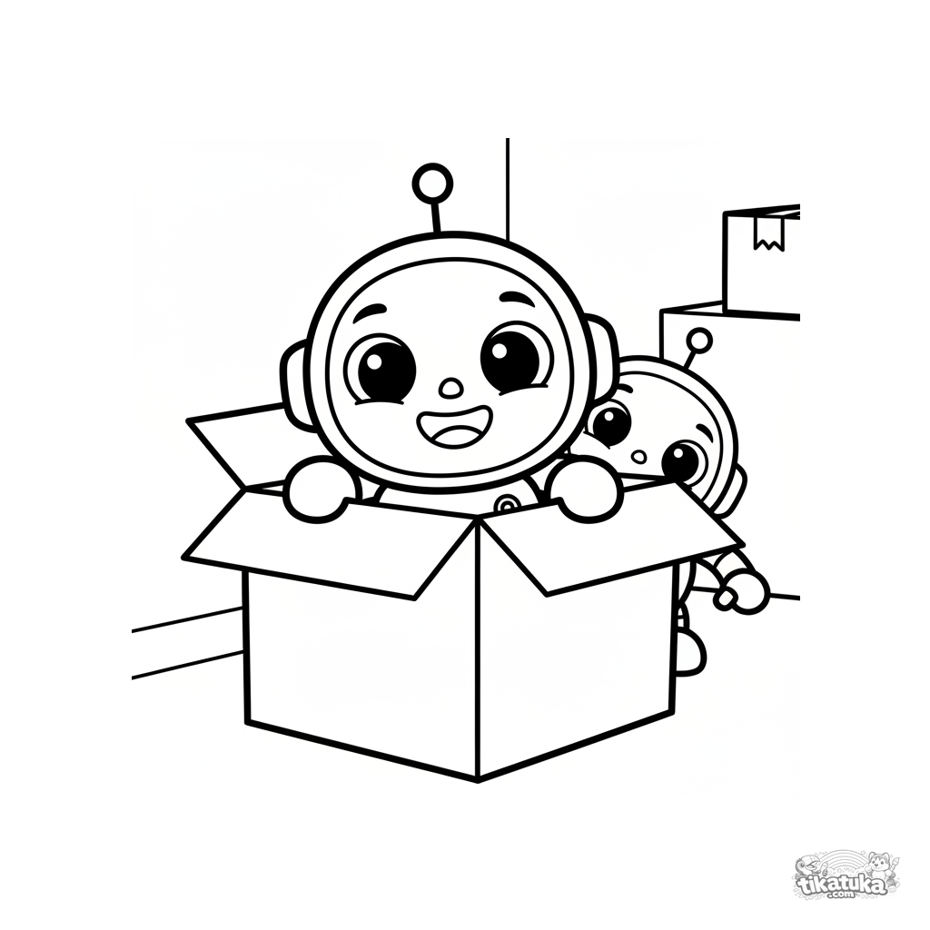 Простая раскраска для малышей с маленьким роботом, играющим в прятки за коробкой на складе. Для детей 2-3 лет. Огромные простые формы и милое выражение.